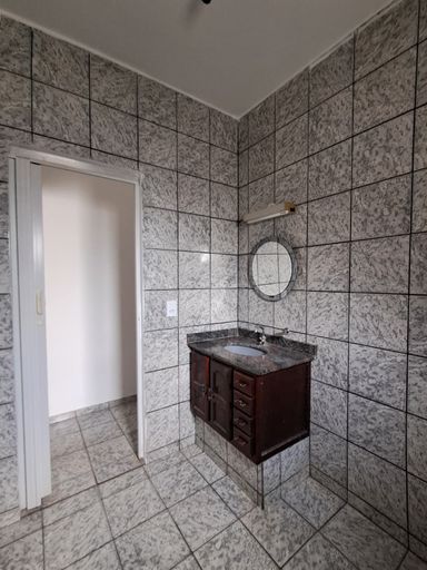 1 banheiro com gabinete e espelho