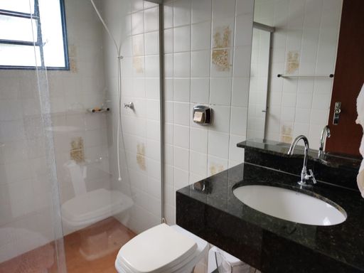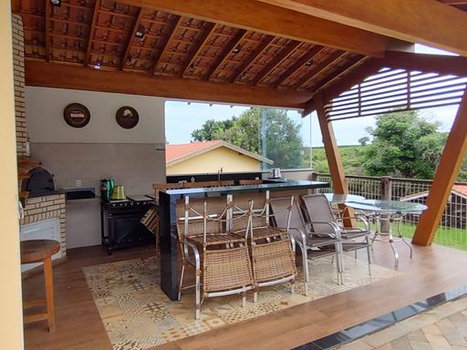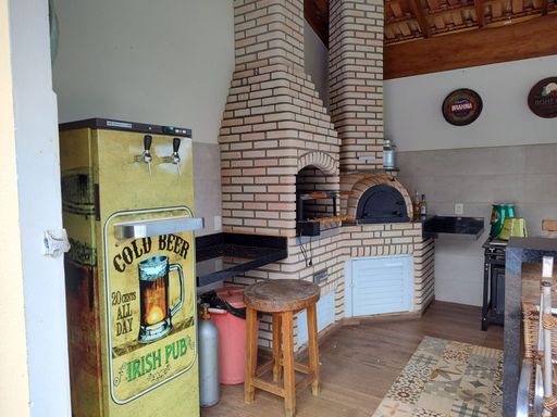 Área gourmet, com bancada de mármore, 2 mesas de vidro com 8 cadeiras , churrasqueira, forno à lenha, fogão industrial 4 bocas, banheiro